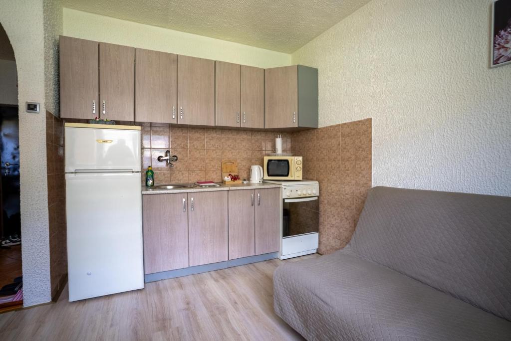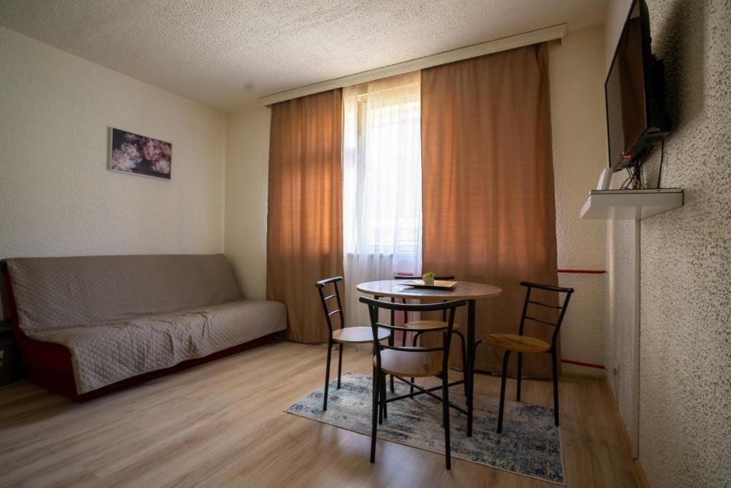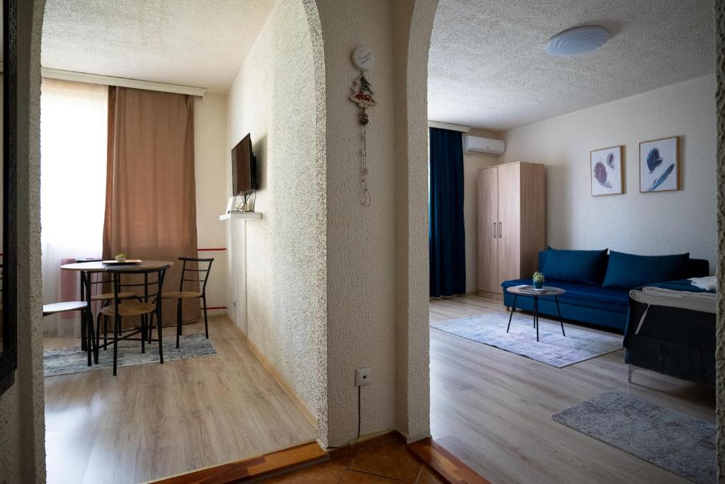 It features one cozy bedroom with a double bed and air conditioning, ensuring a pleasant rest during warm summer nights. The living room is both spacious and inviting, with a comfortable seating area, a TV for entertainment, and a dining space where you can enjoy your meals. Two sofa beds allow the apartment to comfortably accommodate up to five guests, making it a great option for families or small groups.