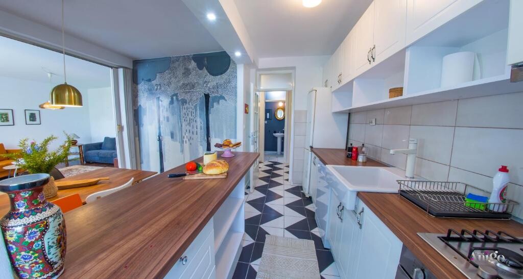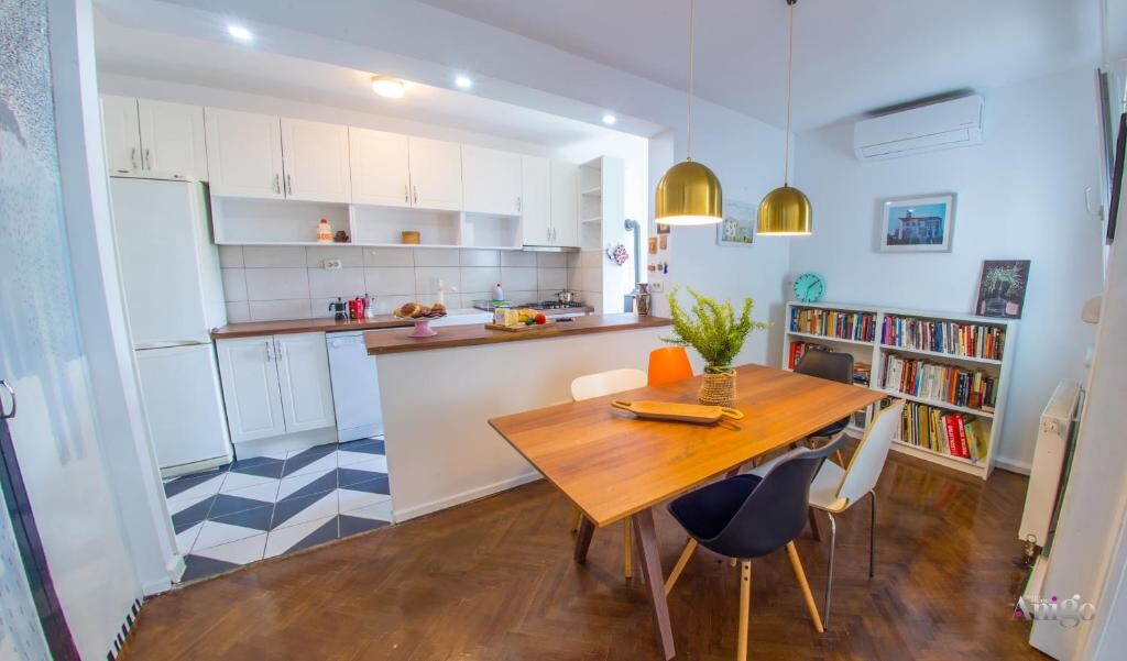 The kitchen, adjacent to the living room, is fully equipped with modern appliances including a dishwasher, oven, refrigerator, cookware, and a kettle. The dining area is perfect for enjoying meals together. The apartment is beautifully decorated with attention to detail and includes bookshelves for your reading pleasure.
