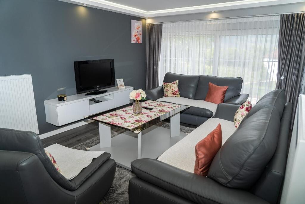 The living areas in both apartments are spacious and inviting, featuring comfortable sofas and a TV, making them perfect for relaxing after a day of exploring.
