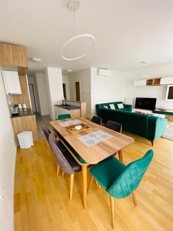Ilidza River Apartments – 303 is a three bedroom apartment located on the third floor. It has a spacious living room with flat TV heating and air conditioning. There is a comfortable sofa which can be a sofa bed if needed.